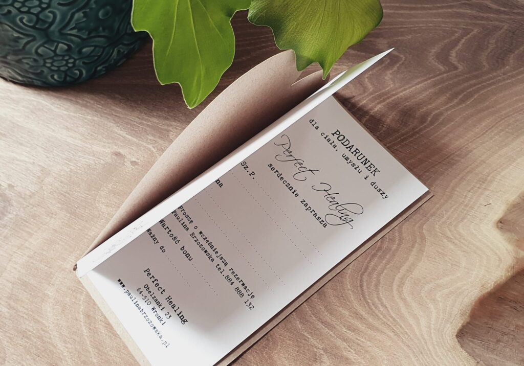• drukowany voucher Perfect Healing — elegancki, jak na zdjęciu, do odbioru w Studio Perfect Healing lub wysyłany pocztą (koszt wysyłki 20 zł)